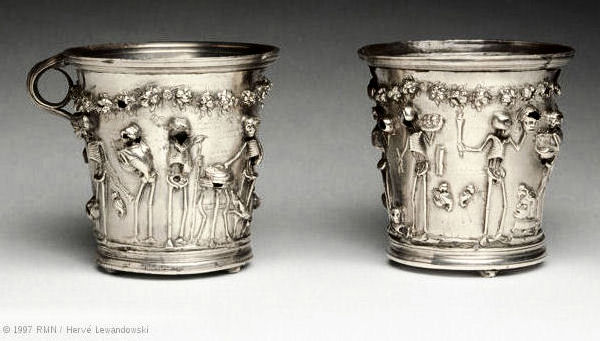 Zwei Silberbecher aus dem Besitz der Familie Gavia, entstanden vor rund 2100 Jahren wahrscheinlich im ägyptischen Alexandria, verschüttet beim Vesuvausbruch in Boscoreale nahe Pompeji, 1894 ausgegraben, heute im Louvre.