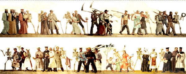 Oskar Martins Totentanz stellt Jesus von der Auferstehung bis zur Himmelfahrt in den Mittelpunkt. Zu beiden Seiten streben ihm Gruppen (begleitet von je einem Skelett) nach. Führend ist das Militär mit Luftwaffe, Marine und Infanterie. Fast ebenbürtig schätzt der Künstler die Deutsche Spinnereimaschinen AG und deren Kaufmann mit dem Merkurstab ein. Da Geistliche und Universitätsprofessoren an letzter Stelle folgen, gelten Jahrhunderte alte Regeln nicht mehr.