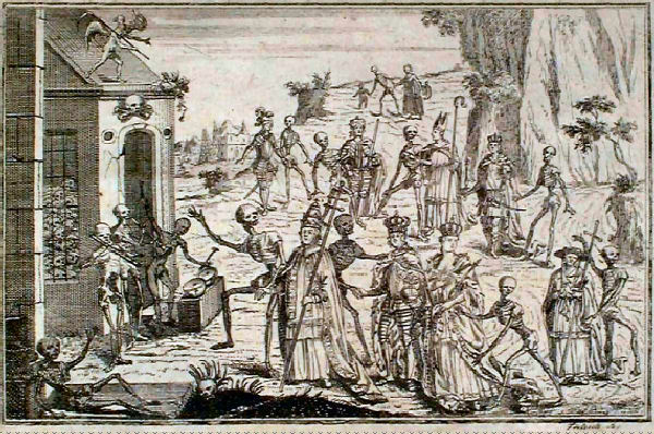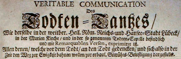 Das Frontispiz zum 50. Teil der in Leipzig veröffentlichten "Gespräche im Reiche der Todten" von David Fassmann dürfte eines der frühesten barocken Beispiele sein. Seit 1722 schreiten darin knapp hundert aus Basel bekannte Gestalten in mehreren Kurven auf das Beinhaus zu. Vor dem Gebäude musizieren drei Skelette.