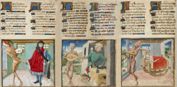 Die oben abgebildete Handschrift entstand erst 1470/85. In Heidelberg, Mainz und München schufen die nächsten Generationen inhaltsgleiche makabre Drucke. Schon bald erweiterten Nachgeborene die Dichtung ganz nach eigener Vorstellung. Noch heute geht die makabre Kunst auf die altbekannten Vorlagen zurück. Leicht erkennbar ist das nicht.
