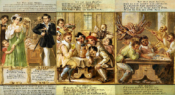 1834 entstand das Gemälde von Georg Kneipp im Landesmuseum Mainz, aus dem abschließend die Szenen 36 bis 38 von 40 zu sehen sind. Die Datierung und der Name des Malers stehen links neben den Herren am Wirtstisch. Im ausgehenden Mittelalter wäre soviel Aufmerksamkeit für weltliche Daten noch undenkbar gewesen.