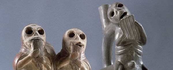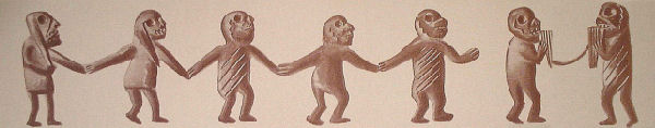 Geblieben sind unter anderem Keramiken, auf denen sitzende Skelette die Panflöte blasen und solche, die rundum Reigentänze darstellen. Beide Geschlechter scheinen gemeinsam zur Musik aufzutreten, aber nachweislich verhüllten damals Männer und Frauen den Kopf.