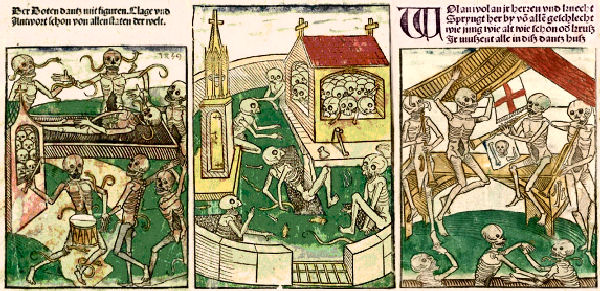 Fest steht: In den Holzschnitten verlassen Verstorbene auf dem Friedhof ihre Gräber. Sie machen Musik und tanzen vergnügt. "Nichts ist besser als der Tod" schrieb schon Petrarca. Hartmann Schedel stellte es in der Weltchronik von 1493 dar. Treffender lässt sich Totentanz in Wort und Bild nicht ausdrücken.