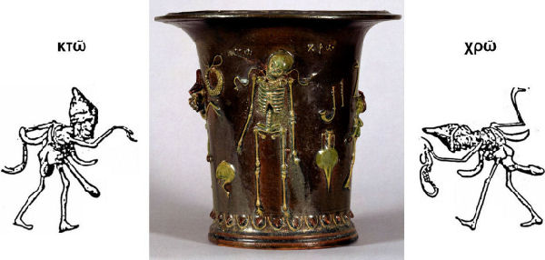 Sowohl das Museum als auch die Deutsche digitale Bibliothek übersetzen die Inschrift ?t? ??? mit Erwirb und nutze! Weiter heißt es online nur: "Skelett, umgeben von guten Dingen für ein Weingelage, seitlich zwei tanzende Krüppel". Lange Beine und geknickte Wirbelsäule sieht die Autorin. Offenbar sollen sich gedachte Lebende zum Wohl des Toten berauschen. In der "History of Drunkenness" beschreibt Mark Forseyth kultischen Alkoholkonsum rund um die Welt.