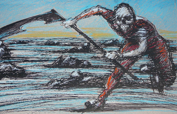 mit der Arbeit an seinem Totentanz. Er zeichnet das kollektive Sterben