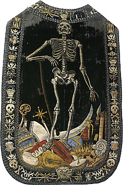 Ende Februar ist die Doktorarbeit unseres Mitglieds Imke Lüders unter dem Titel Der Tod auf Samt und Seide erschienen. Aus diesem Anlass zeigt das Museum für Sepulkralkultur in Kassel liturgische Textilien mit einschlägigen Motiven, vor allem Messgewänder des 17. bis 19. Jahrhunderts aus Deutschland und Österreich, darunter die Kasel aus dem Stift Kremsmünster (siehe L'Art macabre 1 sowie Totentanz aktuell 44).