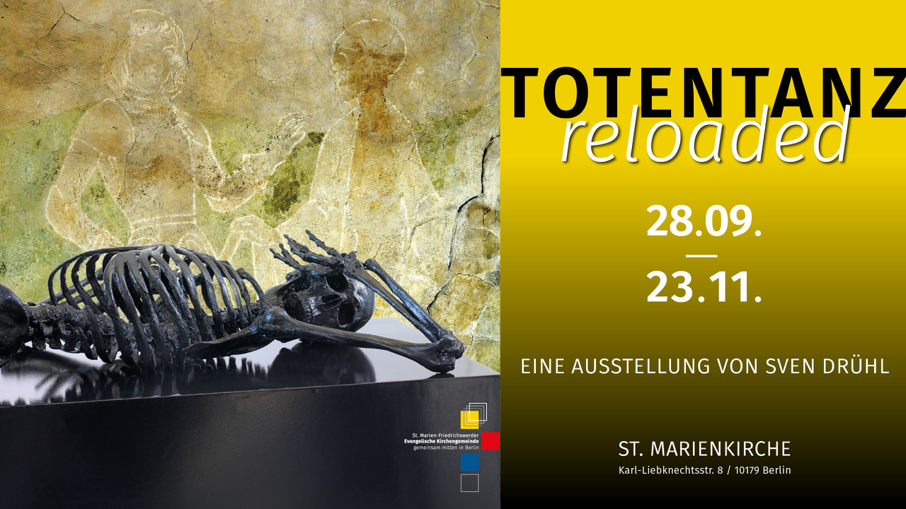 Veranstaltungen zum TotentanzFür weitere Informationen klicken Sie bitte auf die betreffende Veranstaltung Finissage der Austellung "Time Transformations" - Rubica von StrengLöwenpalais, Kunststiftung Starke, Berlin Am Sonntag, dem 9. November 2025, endet die Ausstellung "Time Transformations" der Künstlerin Rubica von Streng im Löwenpalais der Kunststiftung Starke Zur Finissage, die um 14 Uhr beginnt (Ende: 18 Uhr), möchten wir Sie ganz herzlich einladen. Während der Finissage haben Sie Gelegenheit, die Künstlerin persönlich Wie schon zur Eröffnung, wird es auch zur Finissage ein musikalisches Highlight geben: Wir bitten um Anmeldung. Der Eintritt ist frei. Website: https://www.stiftungstarke.de WAS KOSTET DER TOD?vom 26. September 2025 bis 15. März 2026 Ausstellung im Museum für Sepulkralkultur in Kassel Mehr Infos unter: TOTENTANZ reloadedvom 28.09. bis 23.11.2025 Ausstellung von Sven Drühl in der St. Marienkirche in Berlin Mehr Infos unter: Mozart-Jazz-RequiemSamstag, 22.11.2025 / 19:00 Uhr Konzert: Wolfgang Amadeus Mozart / Christian Grosch: "Mozart-Jazz-Requiem" Mehr Infos unter: ES BLEIBT NICHTS ZU SAGENEine musikalische Neuinterpretation des Füssener Totentanzes