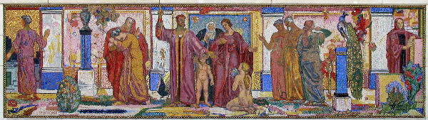 Charles L'Eplattenier (1874-1946) zierte die Außenwände des Krematoriums 1926/27 mit Mosaiken. Das Bild auf der Südseite heißt "Triumph des Lebens", das im Norden "Vers l'Au-Delà", sinngemäß "Unterwegs ins Jenseits". Hier werden Männer, Frauen und Kinder weder von Skeletten geholt, noch mit der Aussicht auf Höllenstrafen geängstigt. Der Künstler zeigt Alte und Junge beider Geschlechter, die in unterschiedlicher Stimmung Abschied nehmen, um in eine andere, golden glitzernde Welt einzuziehen. Im Inneren des Gebäudes steigen die Leiber der Verstorbenen aus den Flammen auf in himmlische Sphären.