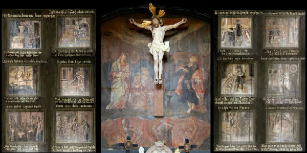 Zuerst sieht man die Kreuzigungsgruppe, unter der Arme Seelen im Feuer büßen. Rechts und links hängt je eine Tafel mit Sinnbildern. Lateinische Klassiker-Zitate dienen als Überschriften; deutsche Reimverse