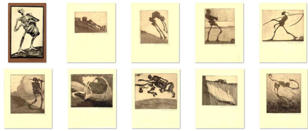 Einzelblätter lauten "Erwachen des Todes", "Er reckt sich und streckt sich", "Heerschau über die Massen", "Er geht an die Arbeit",