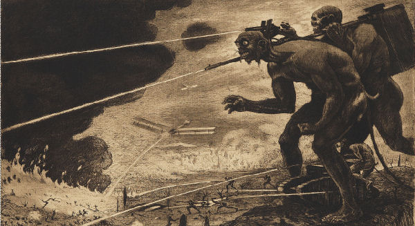 Maschinen hat der Tod befreit / Mit grauser Wonne jeder Stahl und Feuer speit."