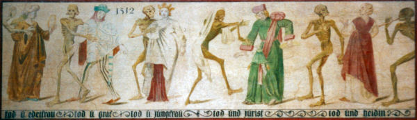 Denkmalpfleger Alfred Peter vollendete das abgebildete Werk 1931 nach älteren Kopien. Auftraggeber war der Apotheker Theodor Engelmann, der am Ende seines langen Lebens niemanden mehr zu fürchten brauchte. Erst jetzt ließ der überzeugte Junggeselle durchblicken, wem er den Tod wünschte: einer eitlen Schönheit, einer keuschen Jungfer, einer andersgläubigen Blondine und einem Rechtsanwalt. Schade, dass man deren Namen nicht kennt.