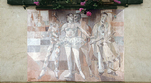 Am Totengässlein 5 erinnert eine Wandmalerei ganzjährig an die Basler Fasnacht. Im Zentrum stellte Ernst Georg Heussler (1903-1982) einen kostümierten Knochenmann dar, der sich von hinten zärtlich an die Wange einer Ballerina schmiegt. Flankiert wird das Paar von einem mit drei Bällen jonglierenden Harlekin und einem typischen Tambour. Links hinten erkennt man die Türme des Münsters.