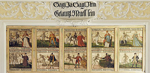 Es ist kein Wunder, dass jüngere Quellen von der Verschönerung des Gebäudes sprechen. Um 1700 wurde das Füssener Benediktinerkloster im Stil des Barock umgestaltet. Auch für den Totentanz in der Annakapelle blieb kaum etwas beim Alten. Ursprünglich hingen die Tafeln wohl in langer Reihe an der Südwand. Der Rahmen mit der Inschrift: "Sagt Ja Sagt Nein, Getanzt Muess sein" entstand für die spätere Anbringung an der Westwand.