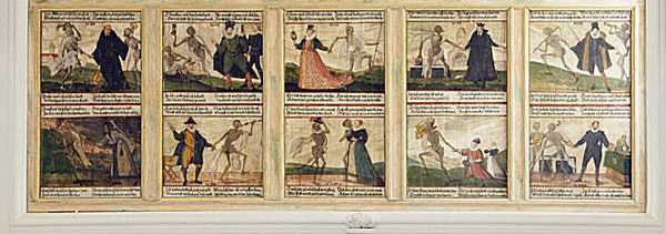 Der Füssener Totentanz sieht aus wie ein alter Bekannter, aber leider ist nichts so sicher, wie es scheint. In der Amtszeit von Abt Matthias Schober schuf Jakob Hiebeler Tafelmalereien für das Benediktinerkloster Sankt Mang (Magnus) im Lechtal. Die erste Erwähnung stammt aus dem Rechnungsbuch von 1599. Abgeschlossen war die Arbeit drei Jahre später. Niemand weiß, was den monatespäter vergleichsweise früh verstorbenen Auftraggeber bewegte. Fühlte er sein nahes Ende?