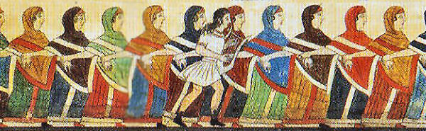Aus Ruvo di Puglia bei Bari stammt das oben abgebildete Stück eines Sarkophags: Mit der Lyra begleitet ein Mann den Reigen der verschleierten Frauen. Gemeinsam umrunden sie den Leichnam und seine Waffen.