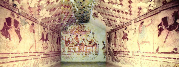 Weit öfter versammeln sich die Lebenden zum Andenken an den Toten bei einem Gelage. Sie trinken, hören und sehen Schaustellern (?) in idyllischer Umgebung zu. Niemand weiß, für wen die unten abgebildete Grabkammer in Monterozzi bei Tarquinia bestimmt war. In Erinnerung bleibt das fröhliche Fest aus der "Tomba del Triclinio".