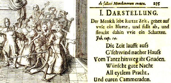 Bis heute geistert sein deutsch-lateinisches Buch durch die Fachliteratur, obwohl aktive Skelette in nur 9 von 75 ganzseitigen Kupferstichen auftreten. Selbst wo Tod und Teufel zusammenarbeiten, stirbt nicht zwingend ein Lebender. Schutzengel und Erziehung erweisen sich als Gegenmittel.