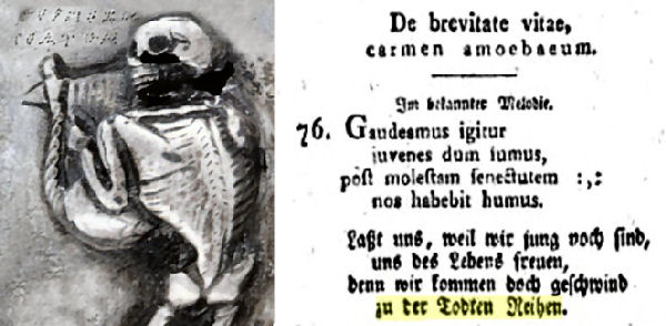 Makabre Kunst bezeugt, dass Verstorbene – von jeher – singen und tanzen können. Das gilt auch für das bekannteste Studentenlied der Welt. 1781 veröffentlichte Christian Wilhelm Kindleben "Gaudeamus igitur" in Halle. Zweisprachig stellt der Text die Verbindung von der Antike in die Gegenwart her. Hilfreicher ist der Druck, den Johann Christian Rüdiger sechs Jahre nach dem Tod des Autors stillschweigend überarbeitet hat.